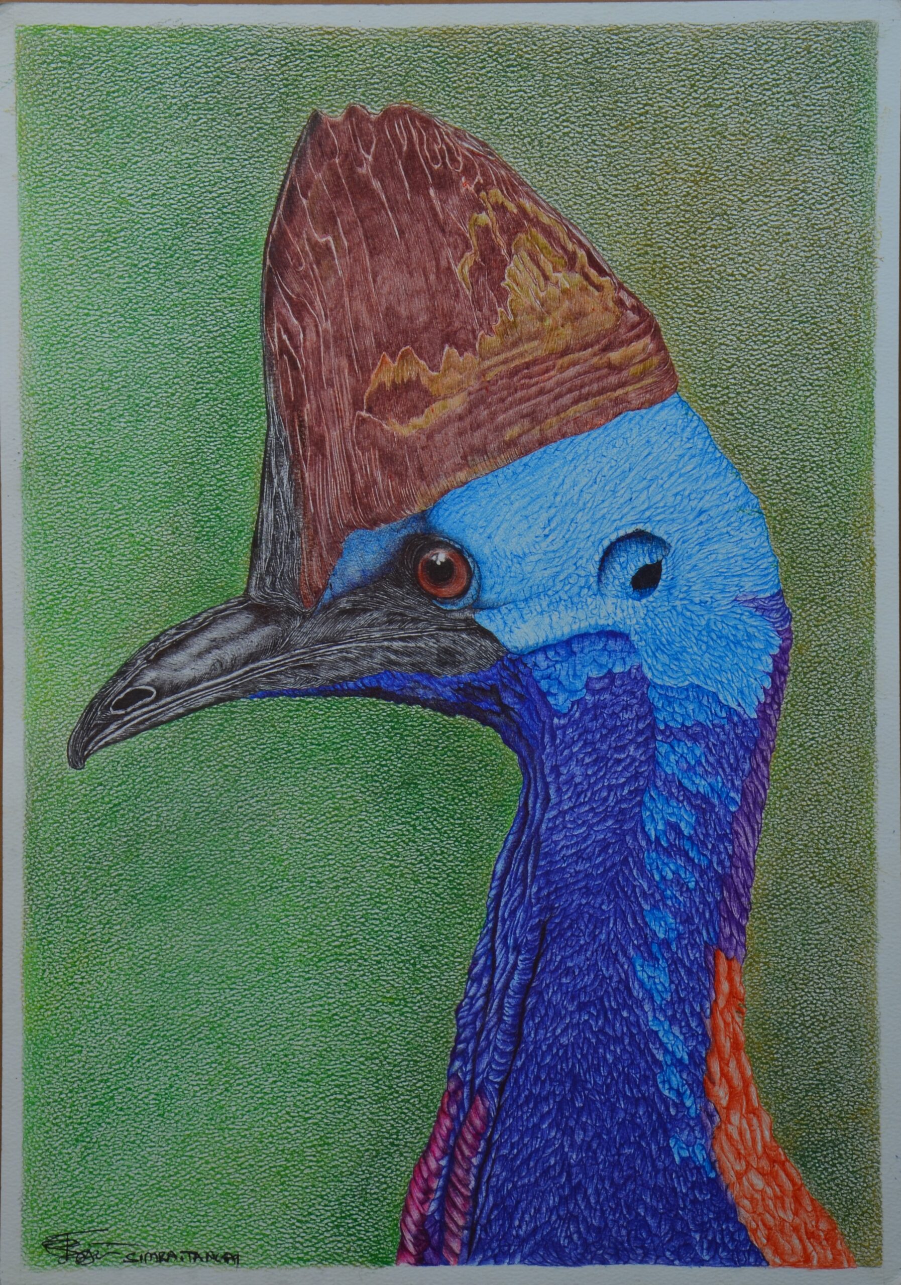 60cm x 42cm A ball point pen drawing and colour pencil background Framed (wooden frame with black mounting board)